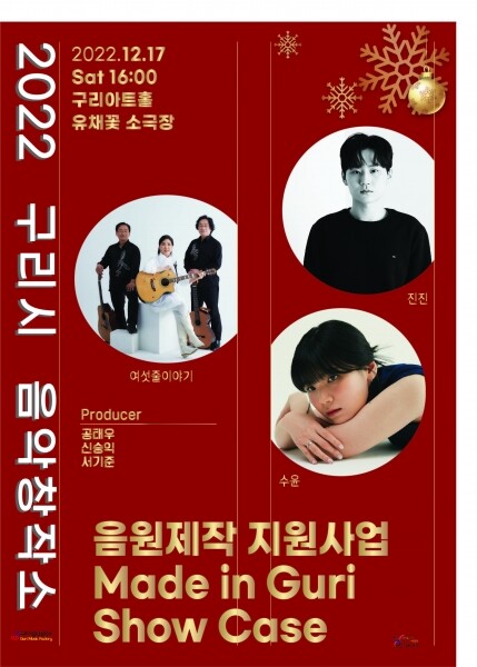 공연 순서는 구리시 직원들의 크리스마스 캐롤을 시작으로 신인가수 3팀의 토크쇼 형식의 발표, 백경현 시장의 격려사, 내외빈 축사, 알에소프레소 시 홍보대사 등 2팀의 축하 무대로 꾸며진다.