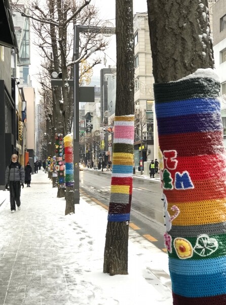 올해로 7회째를 맞은 ‘가로수길 트리아트 니팅’ 전시는 신사동 주민이 직접 뜨개질한 털실옷을 나무에 입히는 거리예술로 앙상한 겨울 가로수에 형형색색 화려함을 더해 주민과 관광객에게 볼거리를 제공한다.