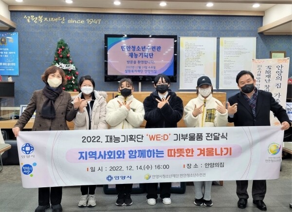 [뉴스써치] 안양시청소년재단 산하 만안청소년수련관 소속 자치조직 ‘재능기획단 WE:D’는 지난 14일 아동양육시설 안양의집에 100만원 상당의 기부물품을 전달했다.