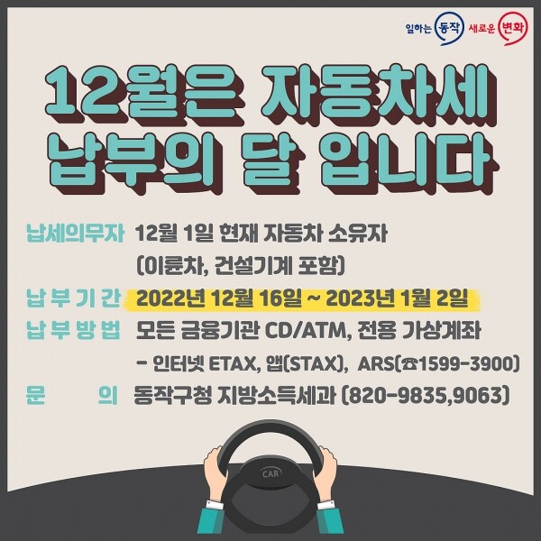과세 대상은 12월 1일 기준 동작구에 등록된 자동차, 이륜차, 건설기계 중 덤프 및 콘크리트믹서트럭 등이고 납부기한은 내년 1월 2일까지다.