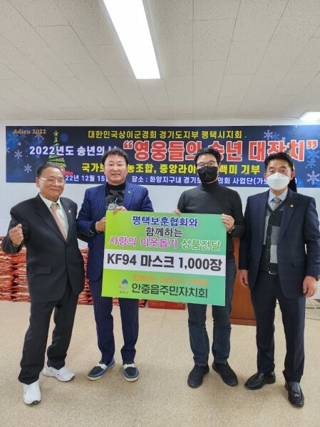 김태옥 안중읍 주민자치회장은 “지난 3년 동안 코로나19로 인해 시민 모두가 힘들었지만 김현제 평택시 보훈협의회장을 통해 특히 평택시 상이군경회원들의 생활 여건이 더 악화됐다는 이야기를 전해 들었다”며 “이렇게나마 우리가 이웃의 손을 잡아주며 조금이라도 도움이 되었기를 바란다 앞으로는 취약계층은 물론 우리 주변에 꾸준히 나눔을 실천할 수 있는 방안을 마련하겠다”고 말했다.