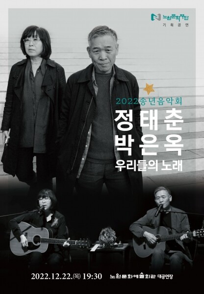 먼저 오는 22일 목요일 7시 30분에는 ‘2022년 송년음악회 - 정태춘 박은옥 ‘우리들의 노래’‘가 노원예술회관 대공연장 무대에 오른다.