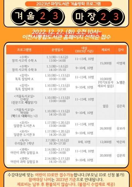 수강신청은 12월 27일부터 시작되며 자세한 프로그램 내용 및 일정은 이천시통합도서관 홈페이지를 통해 확인 할 수 있다.