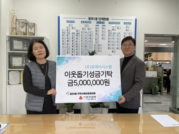 김남효 청라1동장은 “따뜻한 마음을 전해주신 ㈜포에이시스템 관계자분들께 고마움을 전한다”며 “후원자의 뜻에 따라 소중한 성금이 복지 사각지대에 놓인 취약계층을 돕는 데 쓰이도록 세심히 챙기겠다”고 말했다.