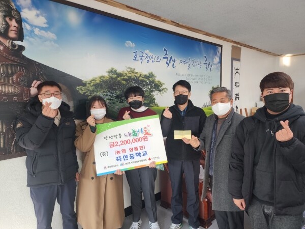 죽산중고등학교 학생들은 일상 속 친환경 소비를 실천하고자 지난 10월 27일 학생들이 직접 만든 물건과 집에서 사용하던 중고물품을 판매하는 면민 플리마켓 2회차 행사를 진행했으며 그때의 수익금으로 농촌사랑 상품권을 마련해 저소득층 이웃들이 따뜻한 겨울을 날 수 있도록 기부했다고 전했다.