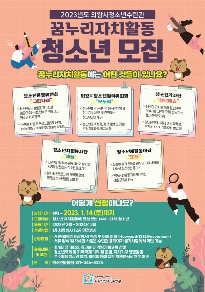 신청기간은 2023년 1월 14일까지 의왕시청소년수련관 홈페이지에서 활동지원신청서를 내려받아 작성 후 이메일로 접수가능하며 1차 서류심사를 거쳐 2차 면접심사를 통해 선발할 예정이다.