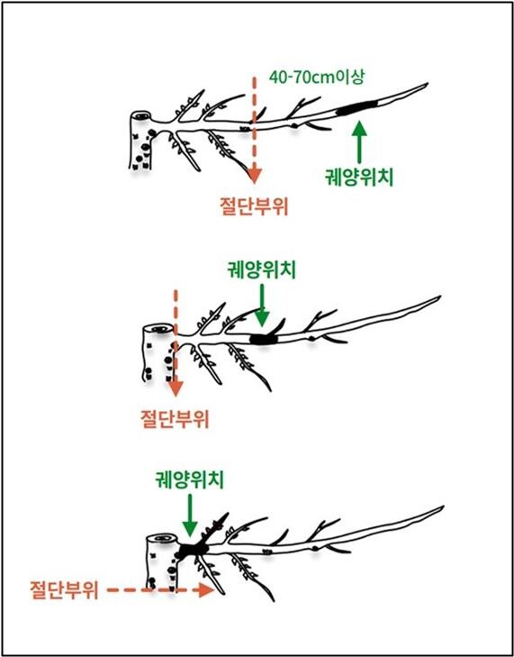 따라서 이들 병원균을 제거하려면 증상이 있는 부위로부터 40㎝ 이상 아래에서 가지를 자른 후, 병원균이 뚫고 들어갈 수 없도록 도포제를 바름으로써 궤양을 제거해야 한다.
