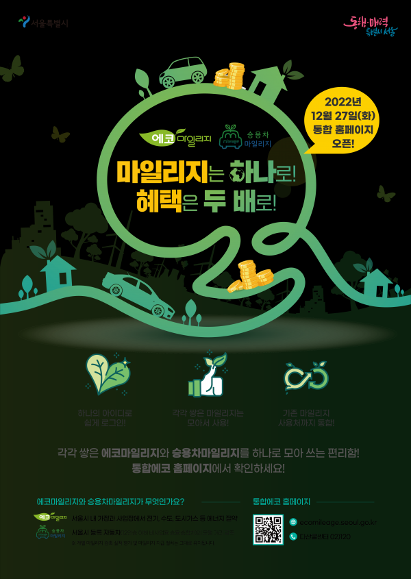 유연식 기후환경본부장은 “서울시 환경마일리지 제도를 더욱 편리하게 이용할 수 있도록 각각 운영되던 에코·승용차마일리지를 하나로 통합했다”며 “탄소배출도 줄이고 다양한 혜택도 받을 수 있는 통합에코 마일리지에 시민 여러분의 많은 관심과 참여를 부탁드린다”고 말했다.