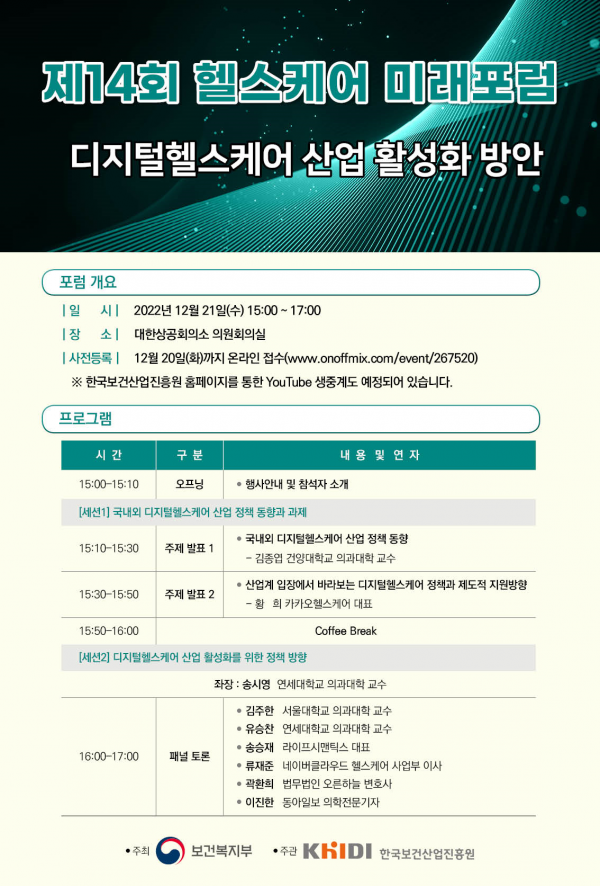 지난 10월 ‘디지털헬스케어 진흥 및 보건의료데이터 활용 활성화 법률’ 국회 발의 이후 디지털 헬스케어 정책 거버넌스와 보건의료 데이터 활용에 대한 전주기 관리체계 마련하고 민감한 개인의료정보를 보호하기 위한 기반에 대한 논의가 본격적으로 진행되고 있다.