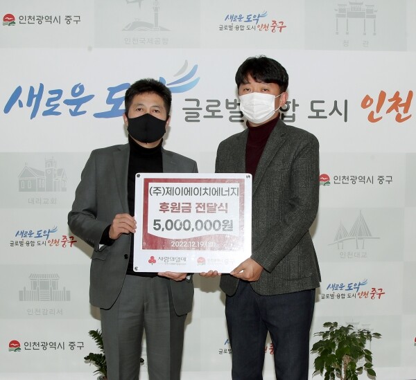 ㈜제이에이치에너지 유정희 대표는 “중구의 어려운 이웃들에게 위로가 되길 희망하며 기부하게 됐다”며 “앞으로도 중구를 비롯한 이웃과 지역사회에 기여할 수 있는 건강이 기업이 되도록 노력하겠다”고 말했다.