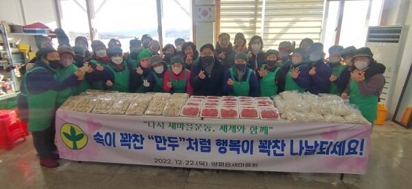 이날 행사는 전날 내린 눈과 한파의 날씨에도 불구하고 양평읍 각 마을 새마을회 남녀 회원 30여명이 이른 아침부터 직접 반죽도 하고 행복으로 가득한 만두를 빚었으며 40가구가 새해에 식사할 수 있는 양의 떡만둣국 재료를 만들었다.