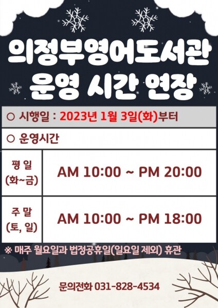 1월 3일 화요일부터 평일에는 오전 10시부터 오후 8시까지, 주말에는 오전 10시부터 오후 6시까지 운영하며 휴관일은 매주 월요일로 동일하다.