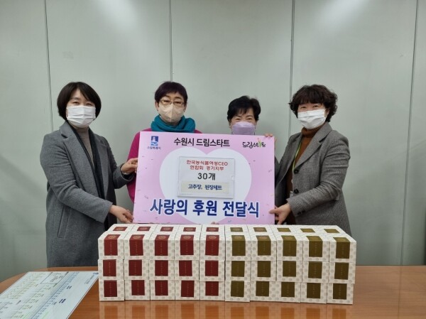 한국농식품여성CEO연합회 송명숙 경기지회장, 나명순 사무총장이 23일 수원시 보육아동과 사무실을 방문해 100만원 상당 후원 물품을 전달했다.
