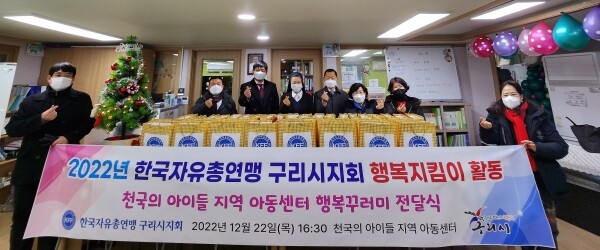 이날 전달식에는 구리시 한국자유총연맹 김석진 회장을 비롯한 회원들과 천국의아이들 지역아동센터 글라라 수녀님이 참석해 각종 먹거리, 겨울용 장갑, 목도리, 텀블러 등이 담겨있는 행복꾸러미 35묶음을 전달하는 행사를 가졌다.