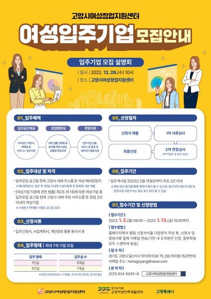 신청은 기한 내 고양시 여성창업지원센터 홈페이지에서 서식을 내려받아 작성한 뒤 이메일로 접수하면 된다.
