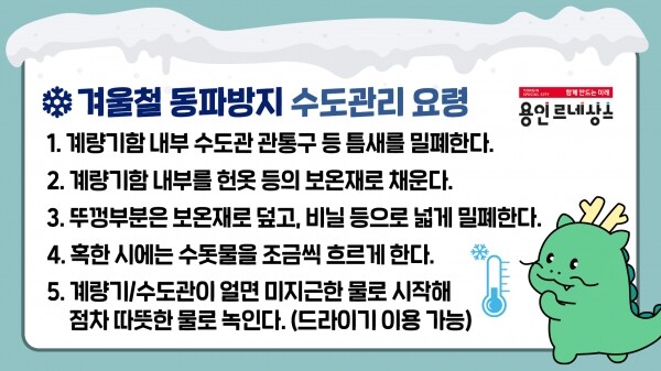 겨울철 동파방지를 위해선 수도계량기 함 내부 수도관 관통구 등 틈새를 밀폐하고 계량기함 내부를 헌옷 등의 보온재로 채워야 한다.