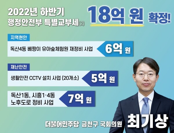 최기상 의원은 “이번 2022년도 하반기 마지막 행정안전부 특별교부세가 확정되어 금천주민들의 생활환경이 더욱 쾌적하고 안전해져 기쁘다”며 “내년에도 금천주민분들의 삶의 질이 향상되도록 최선을 다하겠다”고 밝혔다.