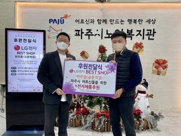 이번 기탁은 관내 취약계층 어르신들의 따뜻하고 안전한 겨울나기를 위해 LG전자 베스트샵 파주점에서 마음을 모아 준비했으며 전자레인지, 인덕션, 제습기, 냉장고 등 전자제품이 후원됐다.