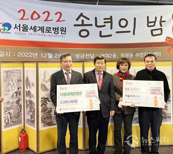[뉴스써치] 서울 송파구에 위치한 서울세계로병원(병원장 정재훈)은 2022년12월 29일 ‘2023 희망온돌 따뜻한 겨울나기’ 사업에 성금을 전달하는 자리를 마련했다. 이날 행사는 서울세계로병원의 임직원들이 자발적으로 모금한 4,000,000원을 서울세계로병원 송년의 밤 행사장에서 거여2동과 위례동 주민센터에 기탁, 지역사회의 어려운 이웃을 돕는 일에 앞장섰다.