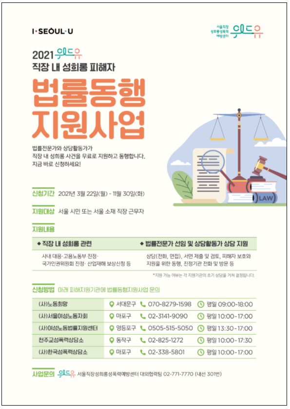 한편, 서울시 위드유센터는 본격 시행에 앞서 지난해 ‘직장 내 성희롱 피해자 법률동행지원사업’을 시범운영해, 총 16건의 사건을 지원한 바 있다.