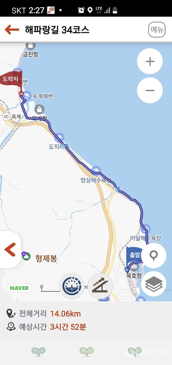 34코스 트레킹 거리는 14.06km 였고, 걸은 시간은 휴식시간을 포함하여 3시간 52분이 소요되었다. 34코스 트레킹을 완료함으로써 해파랑길 동해시구간 2개 코스(33코스 ~ 34코스) 트레킹을 모두 완료하고 강릉구간으로 진입하게 되었다.