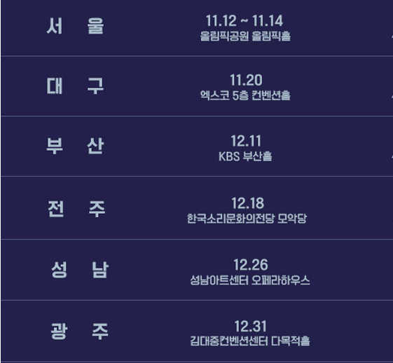 이승윤 정홍일 이무진 싱어게인 TOP3 전국투어 콘서트는 서울을 시작으로 대구, 부산, 전주, 성남과 12월 31일 투어의 마지막인 광주까지 총 6개 지역을 돌며 전국 각지의 팬들을 만난다.