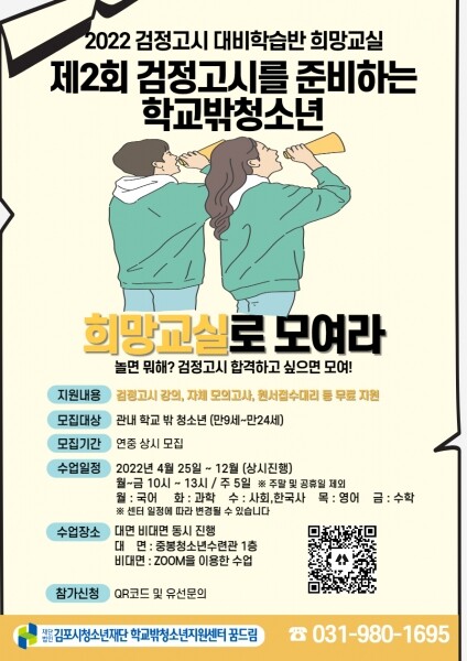 연중 운영되는 검정고시 대비반‘ 희망교실’은 관내 학교 밖 청소년을 대상으로 전액 무료로 수강할 수 있고 수업과목은 국어, 영어, 수학, 과학, 사회, 한국사 6과목을 온라인 및 오프라인 동시 수업진행 하는 방식으로 청소년들의 개인적 환경에 의한 근로형 및 원거리로 인해 수업참여가 어려운 경우 등도 함께 참여 할 수 있도록 운영한다.