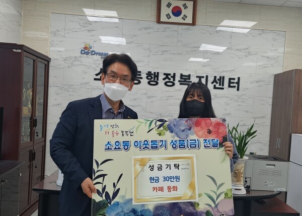 장지봉 소요동장은 “항상 어려운 이웃을 위한 사랑 나눔에 감사드리며 기탁받은 성금은 관내 홀로 계신 어르신과 어려운 이웃들에게 소중히 전달하겠다”고 전했다.