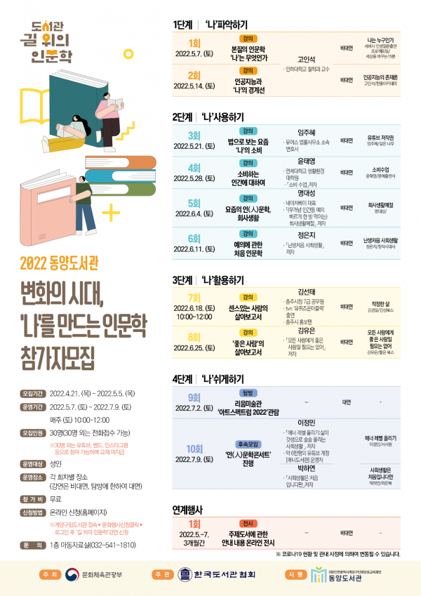 강연 이후에는 주제도서 온라인 전시와 토론회 등 인문학 강연에 대한 이해도를 높일 수 있는 후속 행사도 가질 계획이라고 전했다.