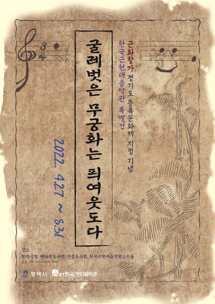 시 관계자는 “이번 전시는 경기도의 첫 번째 근대음악유산 ‘근화창가’를 비롯해 평택시가 한국 근대음악 유산의 도시임을 알리기 위해 기획하게 됐다”고 하면서“평택시가 경기음악의 중심이자 K-문화의 원천지로 거듭나는 데에 최선을 다하겠다”고 밝혔다.