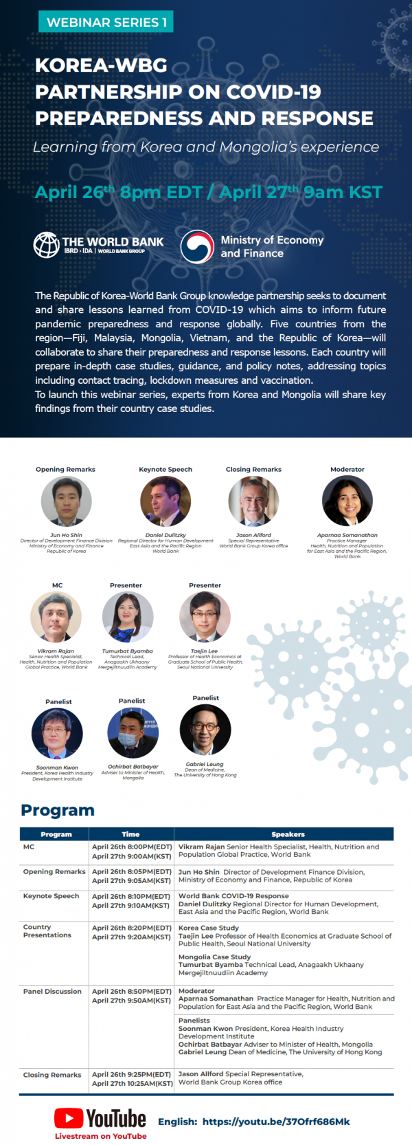 ? 첫 번째 세션은 세계은행의 코로나19 지원·대응 현황을 소개하는 시간이며 ? 두 번째 세션은 국별 사례연구 중 한국과 몽골의 연구 결과를 발표하고 ? 마지막으로 연구 결과 중 개도국에 공유할 수 있는 교훈을 바탕으로 아시아 전문가들의 심도 있는 토론이 진행될 예정이다.